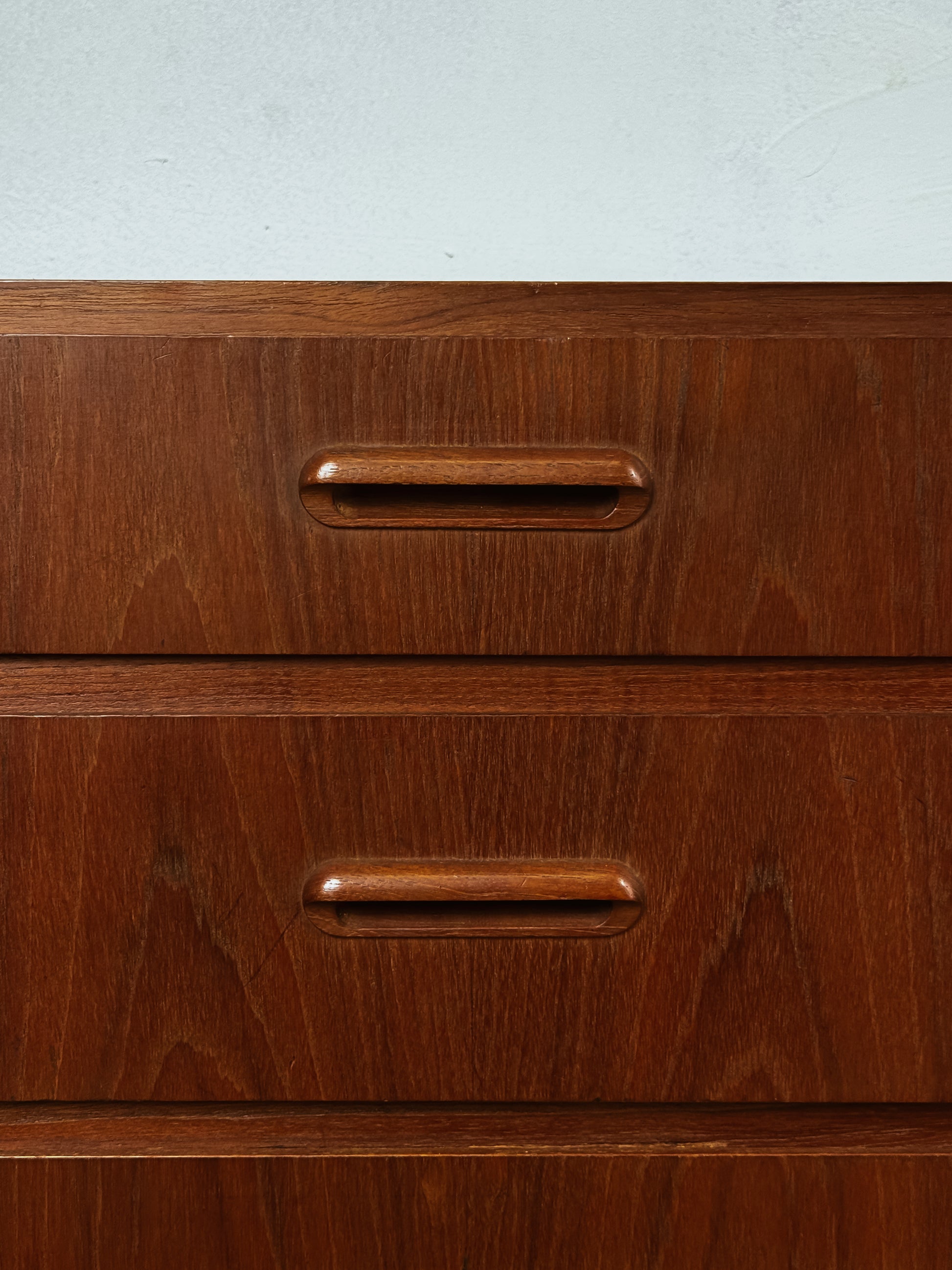 Caratteristiche Distintive Design Danese Le maniglie scolpite arrotondate si integrano perfettamente nei frontali evitando qualsiasi elemento decorativo superfluo testimoniando il funzionalismo scandinavo. Le gambe sottili cilindriche affusolate sono dettaglio distintivo del periodo che conferisce senso di leggerezza e slancio verso l'alto mantenendo i mobili visivamente poco ingombranti pur offrendo praticità. Le venature del legno aggiungono profondità e carattere al mobile.