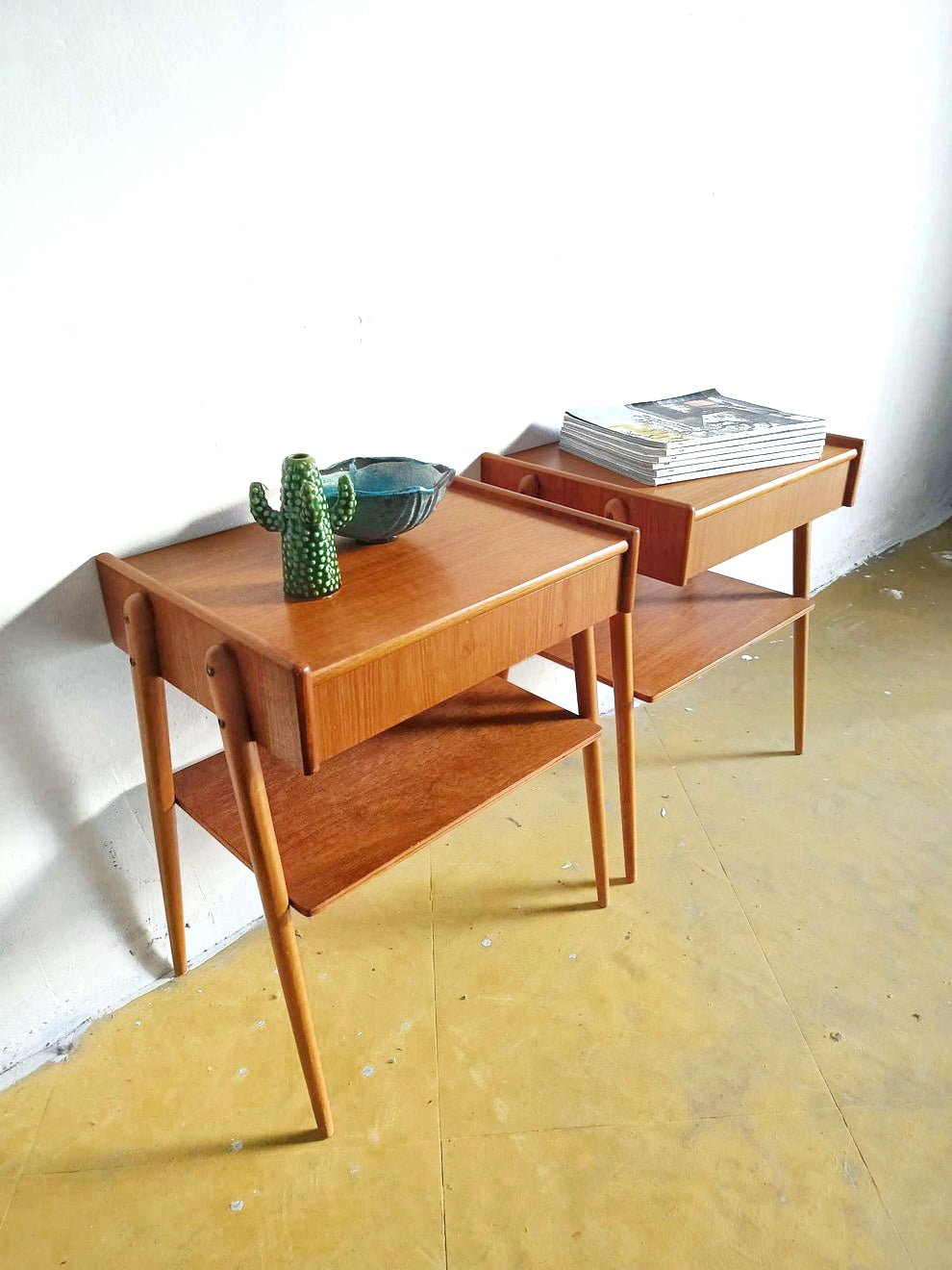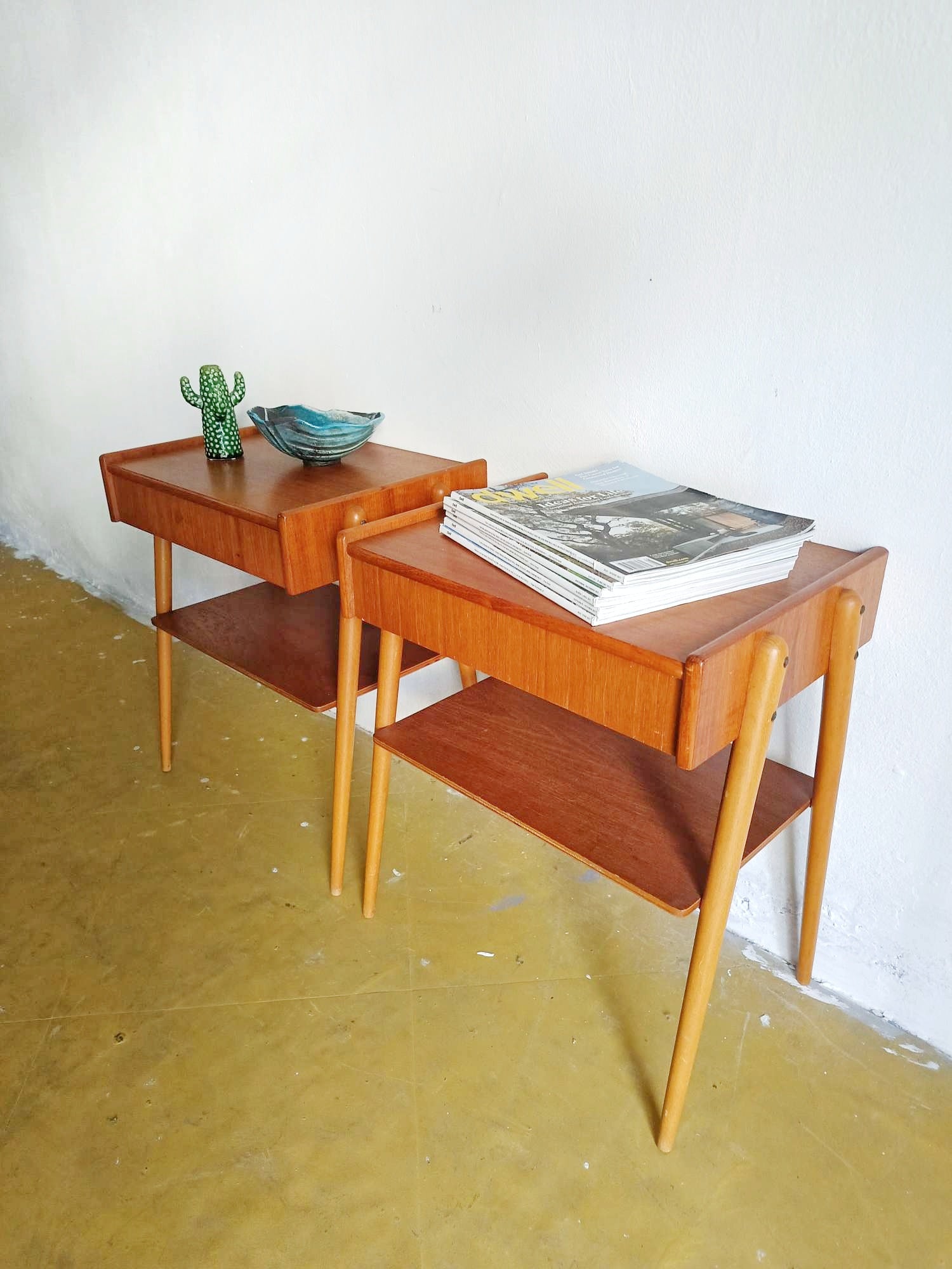 Coppia comodini AB Carlström & Co. Möbelfabrik vintage anni cinquanta in teak con cassetto sospeso superiore, mensola inferiore aperta, gambe cilindriche leggermente inclinate e bordo rialzato sul piano, perfetti per camera da letto mid-century scandinavo minimalista. Questa elegante coppia prodotta da AB Carlström rappresenta l'eccellenza del design nordico funzionale dove le linee semplici pulite incontrano la praticità versatile, ideale per ambienti che cercano mobili essenziali con stile senza tempo autentico.