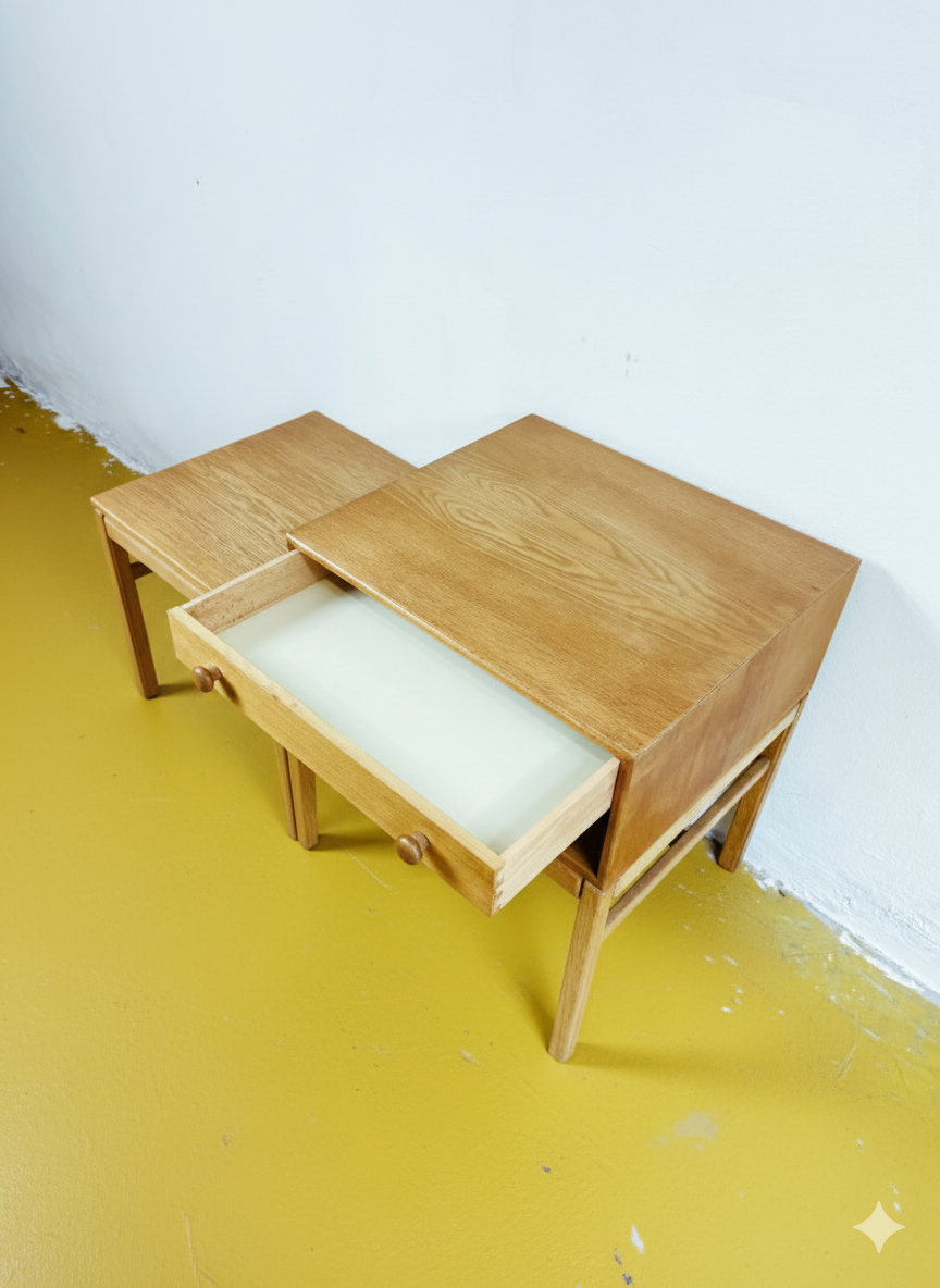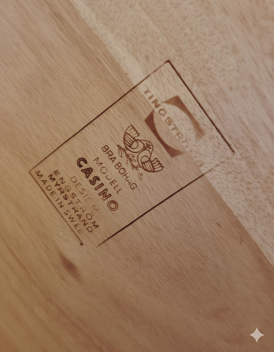 La particolarità distintiva risiede nella composizione asimmetrica con la seduta ampia, cassetto singolo e ripiano aperto si integrano in un equilibrio studiato che rompe la simmetria tradizionale mantenendo un'armonia perfetta. Le gambe slanciate con rinforzi laterali mostrano lavorazione caratteristica della migliore produzione svedese.