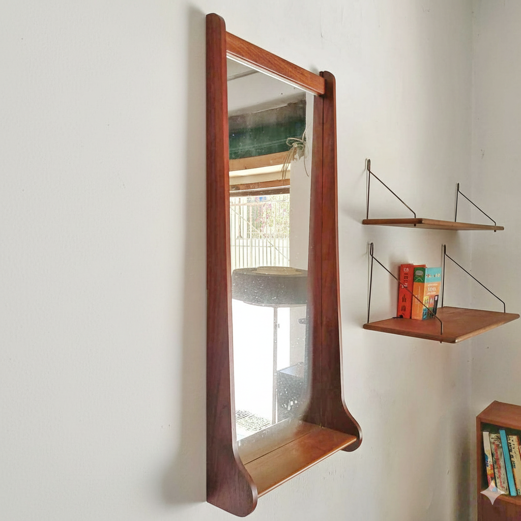 Questo specchio prodotto da Pedersen & Hansen rappresenta un elegante esempio del design scandinavo degli anni '60, caratterizzato da una cornice in teak che integra funzionalità aggiuntive in una composizione verticale armoniosa. La struttura presenta proporzioni allungate con montanti laterali che si sviluppano oltre la superficie speculare, creando una configurazione che va oltre la semplice funzione riflessiva.