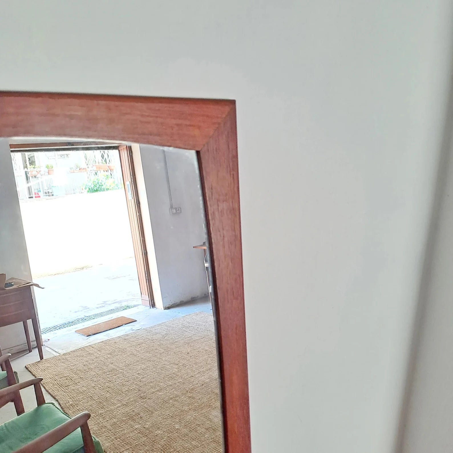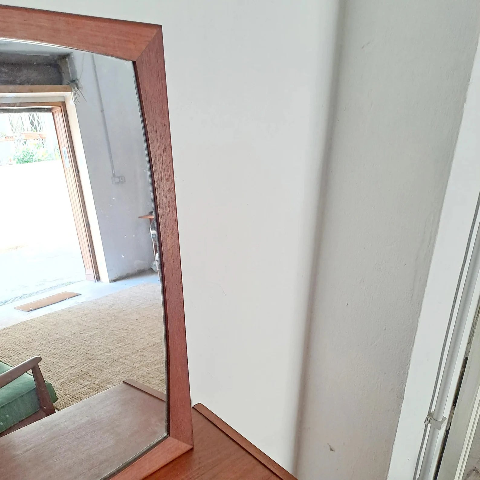 Il legno di teak presenta venature naturali particolarmente evidenti che creano pattern lineari lungo i montanti, mentre la patina d'uso conferisce carattere autentico al pezzo. La cornice mantiene spessore generoso che definisce chiaramente il perimetro dello specchio senza appesantire visivamente, bilanciando presenza e leggerezza.